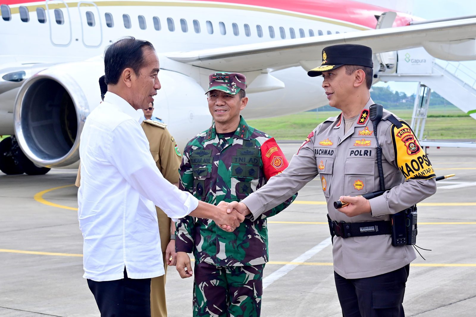Tampak menyambut kedatangan Presiden di bandara tersebut yakni Kapolri Jenderal Listyo Sigit Prabowo, Pj. Gubernur Sumatera Selatan Agus Fatoni, Pangdam II/Sriwijaya Mayjen Yanuar Adil, dan Kapolda Sumatera Selatan Irjen Pol. A. Rachmad Wibowo, Kajati Sumsel Dr. Yulianto, S.H, M.H, Ketua DPRD Sumsel Hj. R.A. Anita Noeringhati, SH, MH, Kolonel Laut (P) Sandy Kurniawan, Kolonel Pnb Rizaldy Efranza, S.T, M.N.S.S,. Kabareskrim Polri Komjen Pol. Drs.Wahyu Widada, M.Phil.