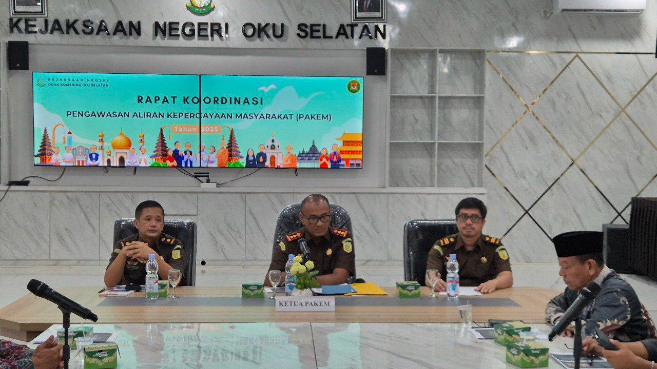 OKU Selatan Sumsel–Untuk memperkuat pengawasan aliran kepercayaan dan keagamaan Kejaksaan Negeri (Kejari) OKU Selatan gelar rapat koordinasi (Rakor) bersama Tim Pengawasan Aliran Kepercayaan dan Keagamaan Dalam Masyarakat (PAKEM) Kabupaten Ogan Komering Ulu (OKU) Selatan pada Rabu (11/06/2025).